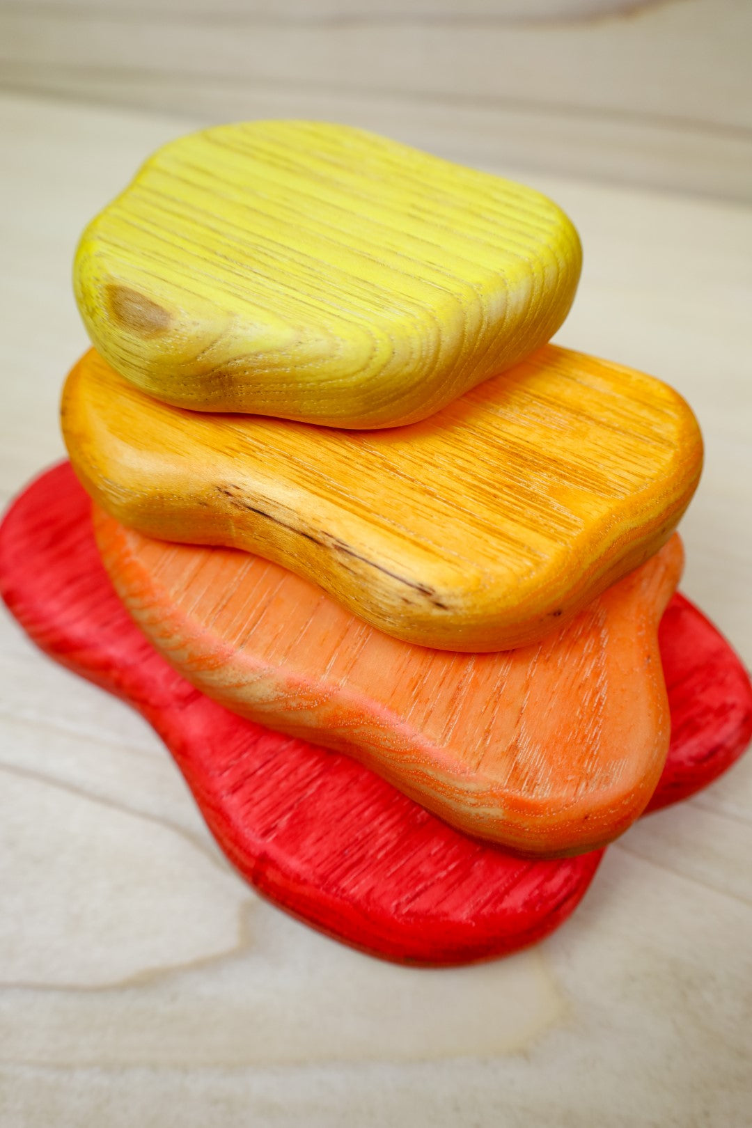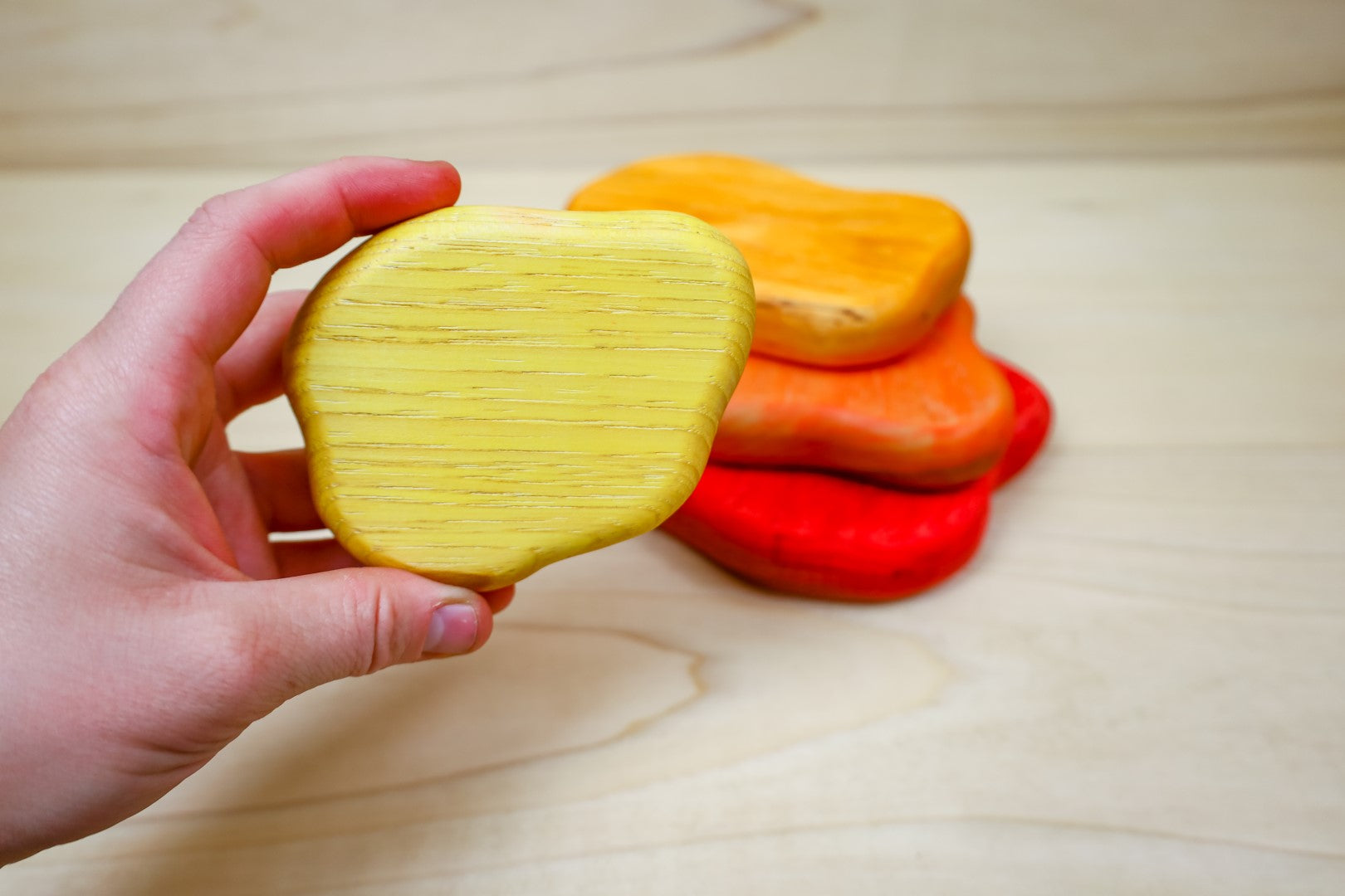Made from solid hickory hardwood, the hardest wood native to North America. Painted with food grade dyes and sealed with nontoxic shellac sealant and a beeswax finishing oil. These blocks are polished buttery smooth and are excellent for sensory additions to playtime.