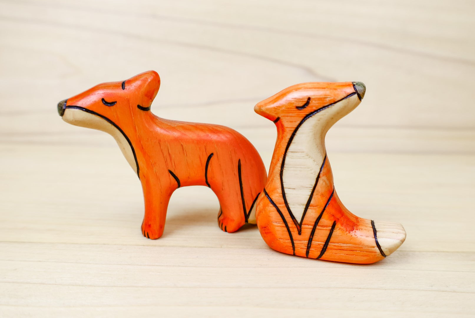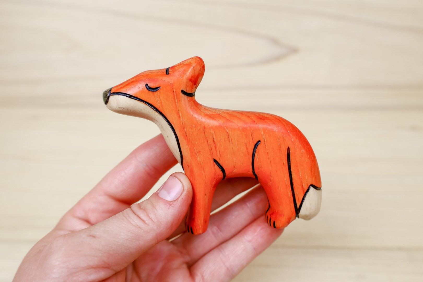 These heirloom-quality Foxes are handcrafted from solid hickory hardwood, the hardest wood native to North America, and are then painted with food-grade dye, nontoxic and hypoallergenic shellac sealant, and an all natural beeswax finish paste. No two handcrafted items are alike, every item is unique! Therefore, colors may vary slightly.